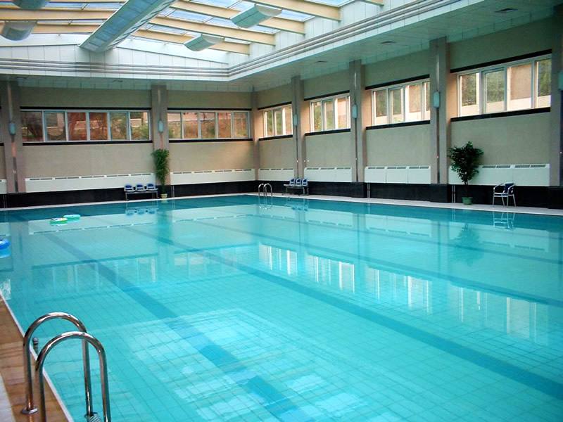 三、裝飾材料:由于游泳池室內濕度較大,各種飾面材料應慎重選用,墻面宜用淺色大理石或釉面磚,而不宜用油漆或涂料,地面宜用防滑地磚,切忌用花崗巖;天花板宜用鋁板或鋁塑板,避免使用木質材料。屋頂網架設計應考慮2點:一是網架應便于今后防腐處理,高檔泳池可用不銹鋼網架;二是網架玻璃應能清洗,尤其是公路邊的建筑,大面積的玻璃十分易積塵。水下部分的進出水口、爬梯等應用不銹鋼制品;溢水溝蓋板常用塑料格柵,但這種格柵清洗十分困難。