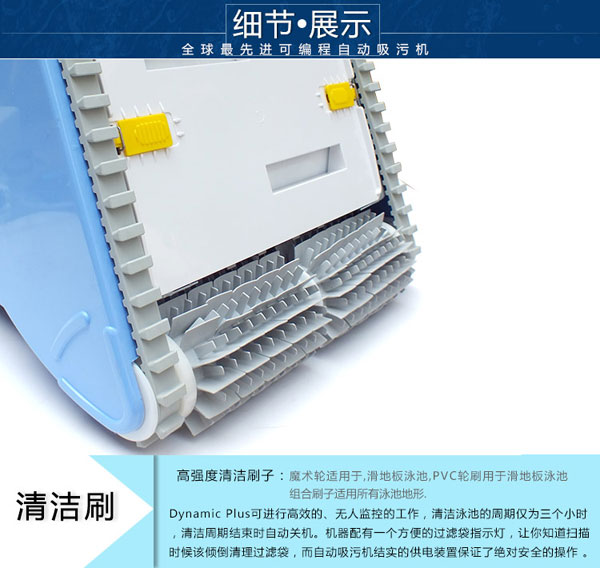 20米帶線長,帶推車,帶24V直流電變壓器,帶遙控器,爬墻智能型,電纜帶防糾纏器,變壓器帶過載指示燈,主機帶記憶芯片,遙控器帶遍程功能。20米線長,全智能帶無線遙控器,能爬墻,可在無人看管的情況下對游泳池底部及池壁進行徹底刷洗,電纜帶萬向節可防電線纏繞,適用于長度為20米至30米的泳池。