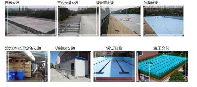 在確定實施方案后工廠組織生產,拼裝式游泳池的各部件均在工廠生產完成,完成生產后一次性運至安裝現場進行整體組裝。安裝前需要一塊平整、堅實的空曠場地,使用方提供安全的380V高壓電(30-50KW),上下水市政管路。安裝過程為15-25天(根據泳池大小而定)。
